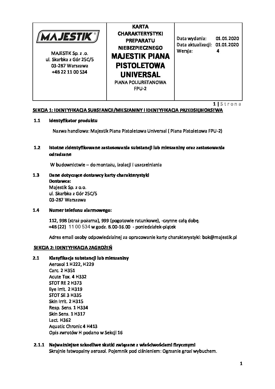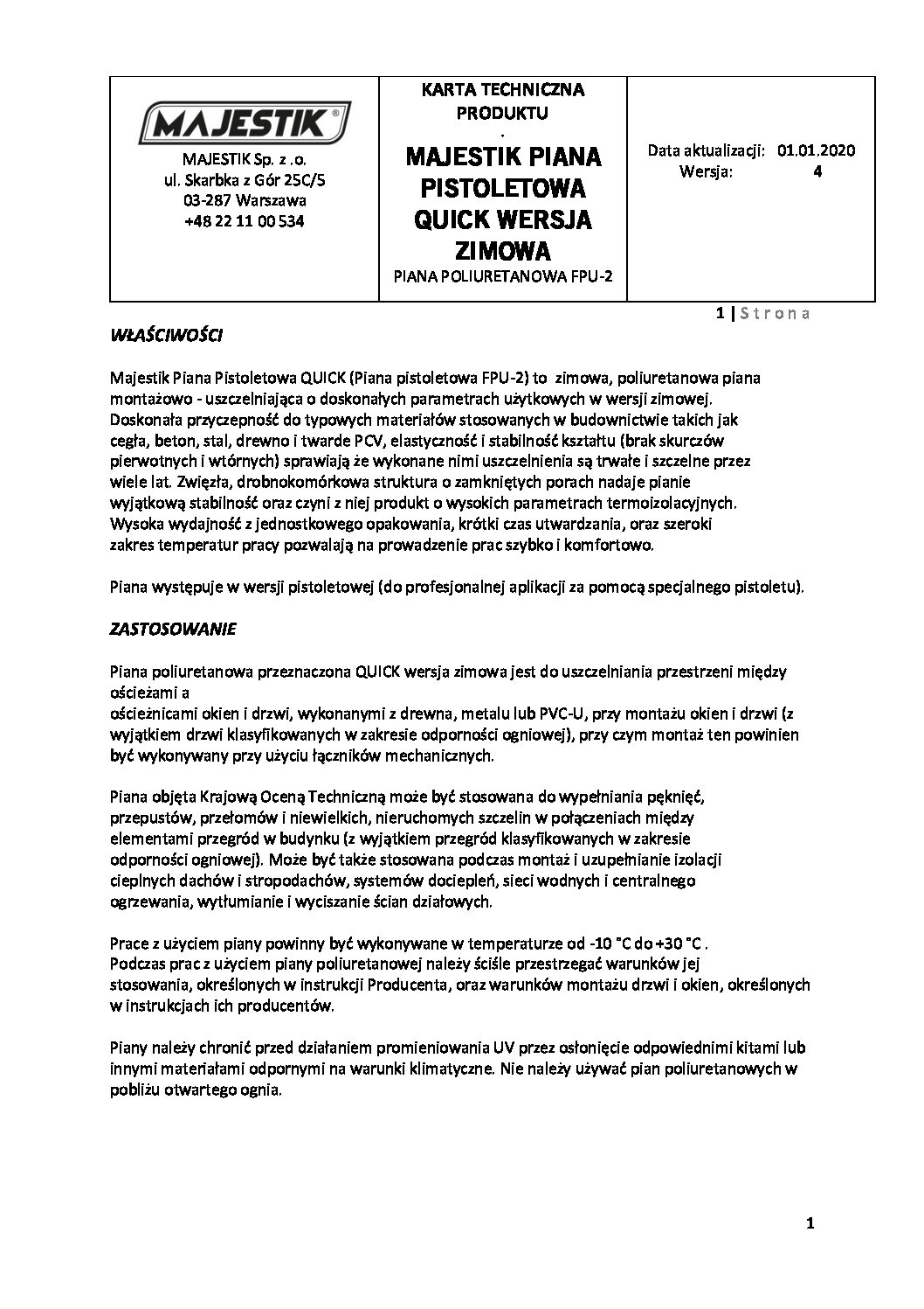 Dzięki piance montażowej niskoprężnej pistoletowej precyzyjnie stworzysz każdą spoinę na wielu typowych podłożach budowlanych. To produkt wielosezonowy, który cechuje się też wysoką wydajnością. Pianki poliuretanowej pistoletowej bez problemu można użyć ponownie, gdyż dzięki zaworowi ograniczone jest twardnienie pianki. Przy aplikacji należy pamiętać o właściwym przygotowaniu powierzchni i zapoznaniu się z wytycznymi dotyczącymi stosowania produktu. Pianka poliuretanowa pistoletowa to gwarancja skutecznego uszczelnienia zarówno w zastosowaniach wewnętrznych, jak i zewnętrznych. Zapraszamy do sprawdzenia pełnej oferty firmy MAJESTIK. W razie pytań można skontaktować się z nami telefonicznie, mailowo lub poprzez formularz dostępny na stronie internetowej.