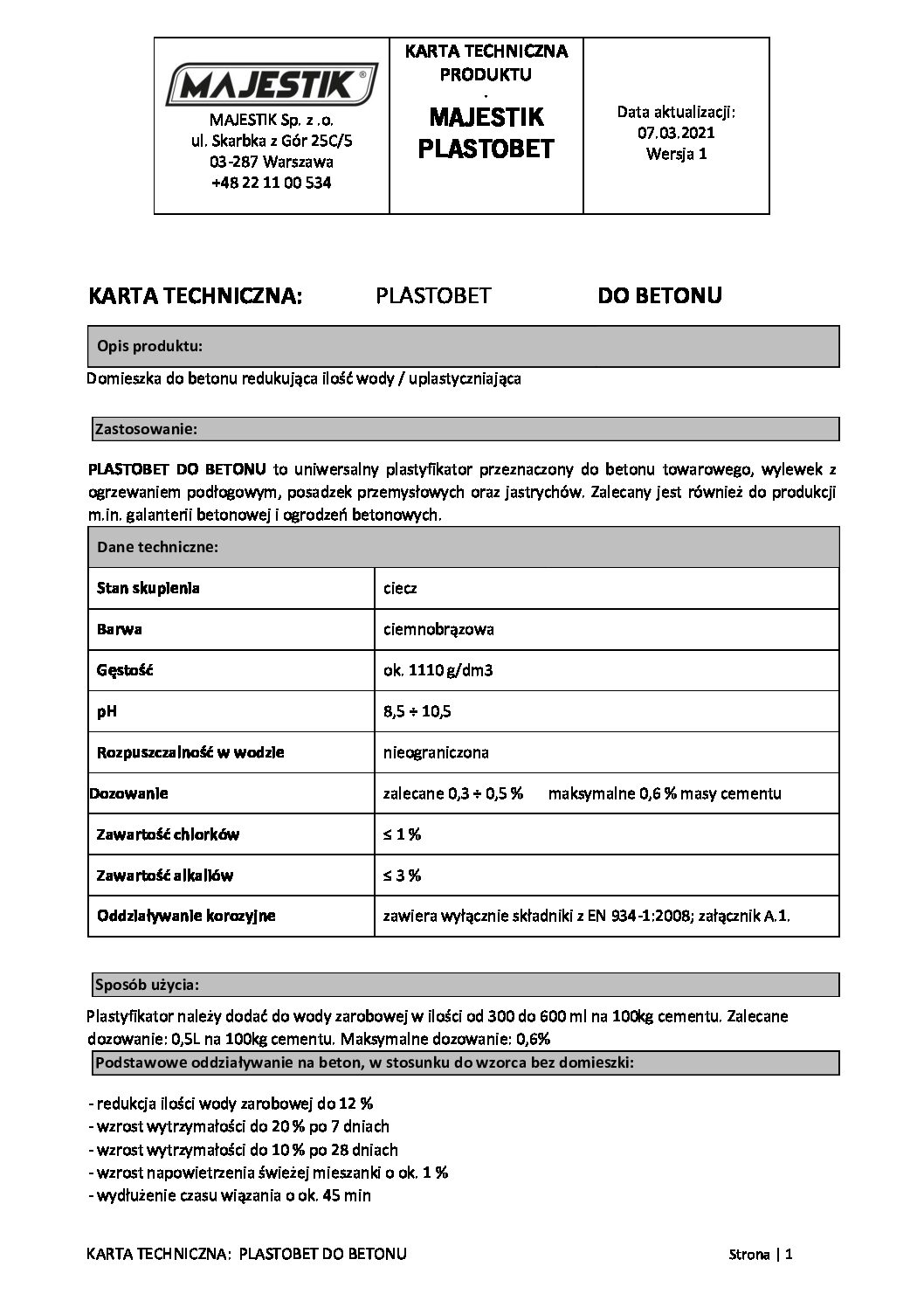 Sposób użycia: Plastyfikator należy dodać do wody zarobowej w ilości od 300 do 600 ml na 100kg cementu. Zalecane dozowanie: 0,5L na 100kg cementu. Maksymalne dozowanie: 0,6%.