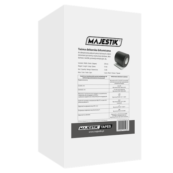 Taśma bitumiczną dekarska przeznaczona do zabezpieczeń połączeń pokryć dachowych z takimi elementami jak: kominy, maszty, kosze dachowe, okna dachowe, świetliki, przewody wentylacyjne itp.