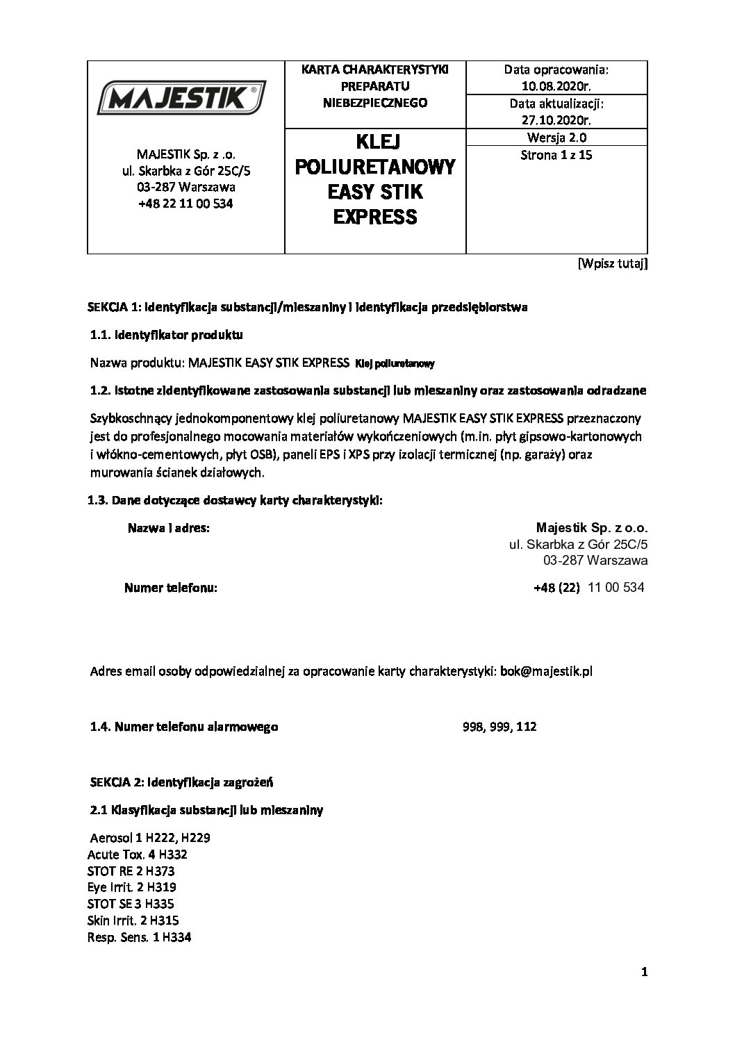 Podłoża przygotowane do klejenia płyt powinny być płaskie, wyrównane, dobrze oczyszczone oraz odpylone. Mocowane płyty termoizolacyjne powinny mieć proste krawędzie. Dopuszczalne odchylenie od płaskości powierzchni ściany wynosi -4 mm i +2 mm. Pomiaru odchyleń należy dokonywać łatą o długości 2 m, z dokładnością do 1 mm. W przypadku ścian charakteryzujących się zbyt dużą nierównością powierzchni, należy wykonać warstwę wyrównawczą (szpachlową). Nie stosować podczas deszczu i silnego wiatru. Bezpośrednio przed aplikacją kleju zwilżyć podłoże. Zabezpieczyć przed ewentualnym zabrudzeniem elementy stolarki i obróbek blacharskich. Dokładnie wymieszać zawartość puszki przez energiczne potrząsanie (30 razy). Puszka powinna mieć temperaturę pokojową (w razie potrzeby zanurzyć puszkę w letniej wodzie). Nakręcić puszkę na pistolet i wyregulować dyszę aplikacyjną. Należy nałożyć klej pasmami w kształcie litery W, z zachowaniem dystansu 2 cm od krawędzi płyty. Pasma powinny być w kształcie sznura o szerokości ok. 3 cm. Grubość utworzonej spoiny powinna wynosić (po przyłożeniu płyty do podłoża) 8 lub 15 mm, w przypadku mocowania płyt z białego EPS i 8 mm w przypadku płyt z XPS i grafitowego EPS. Połączenie płyt termoizolacyjnych z podłożem należy wykonać jak najszybciej po nałożeniu kleju. Czas otwarty, tj. czas zachowania zdolności klejenia w temperaturze (23±2)°C i (50 ± 5)% wilgotności względnej, wynosi maksymalnie 6 minut. Całkowite utwardzenie (czas wiązania) spoiny klejowej następuje po 24h. Czas wiązania może ulec zmianie. Odczekanie kilku minut przed przyłożeniem paneli do ściany, umożliwi wstępne rozprężenie się kleju i ułatwi późniejsze korygowanie położenia. Otwory i spoiny między panelami zapełniać tym samym klejem (podczas utwardzania spienia się i wypełnia puste przestrzenie). Rodzaj i liczbę łączników mechanicznych określa projekt techniczny ocieplenia budynku. Nadmiar kleju usuwać mechanicznie po utwardzeniu, świeże zabrudzenia – płynem czyszczącym do pianki. Pistolet i wężyk czyścić przy użyciu preparatu MAJESTIK PU CLEANER CZYŚCIK DO PIAN.